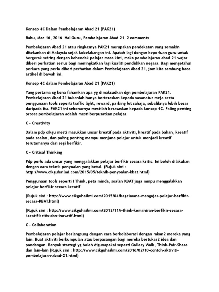 Konsep Pembelajaran Abad 21 : Kemahiran pengajaran dan pembelajaran (pdp) abad 21 merujuk kepada beberapa kompetensi teras, iaitu kolaboratif, celik digital, kemahiran berfikir dan penyelesaian masalah.. Dengan menerapkan konsep tersebut maka siswa akan bisa meraih masa depan gemilang. Pak21 ini sebenarnya mestilah berasaskan kepada konsep 4c. Bapak ibu guru yang memanfaatkan kemajuan teknologi dalam pembelajaran hanya bisa ø pelatihan pembelajaran abad 21 yang diwarnai oleh pemanfaatan teknologi informasi dan komunikasi yang dilaksanakan di sekolah sesuai. Analisis pembelajaran dan kesulitan siswa sma kelas xi terhadap penguasaan konsep fisika. Mohd ariffin bin abdul latif.
